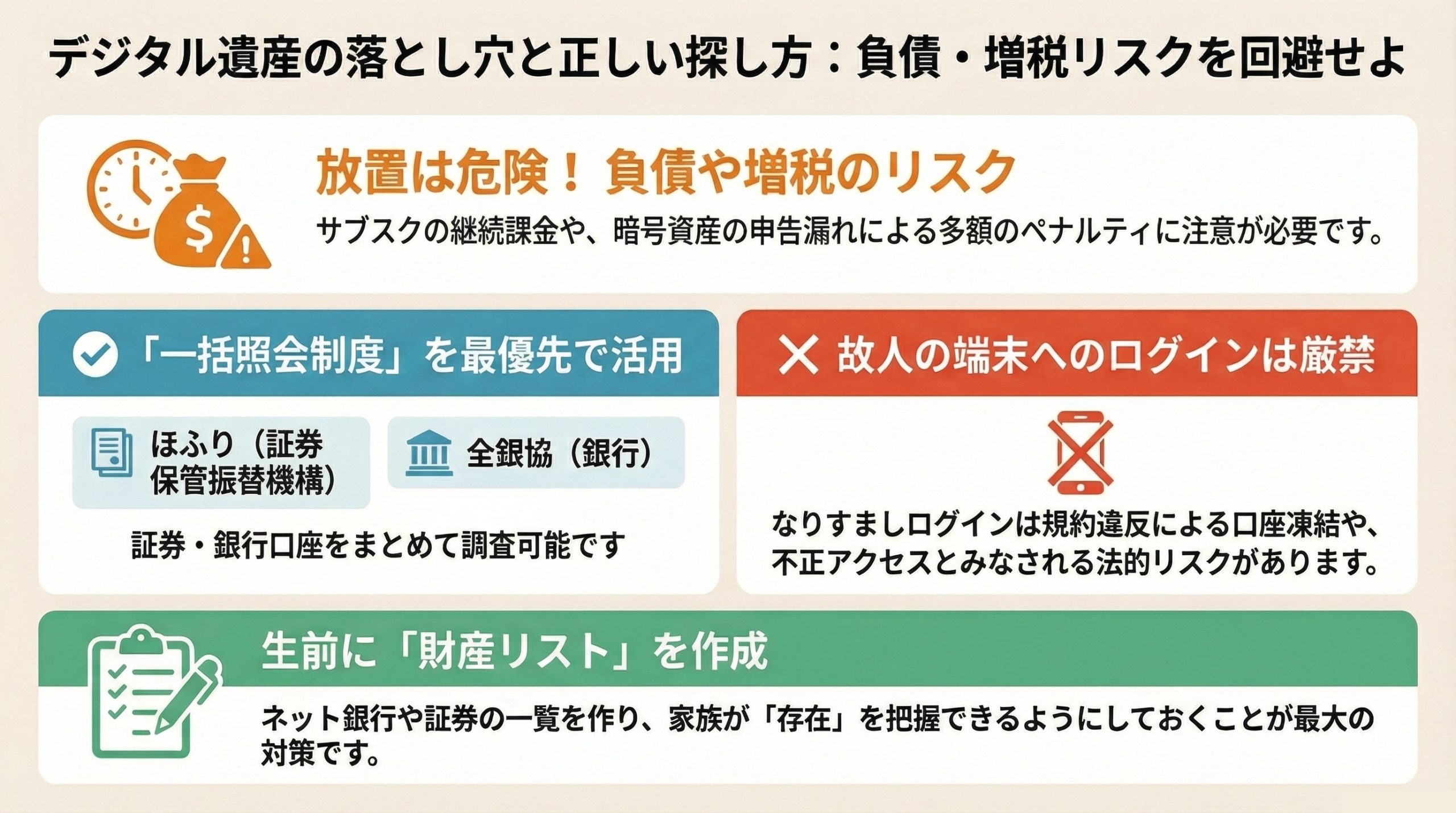 これらのリスクを無視して節税策を進めることは、将来、想定外の追徴課税を招く危険な行為です。